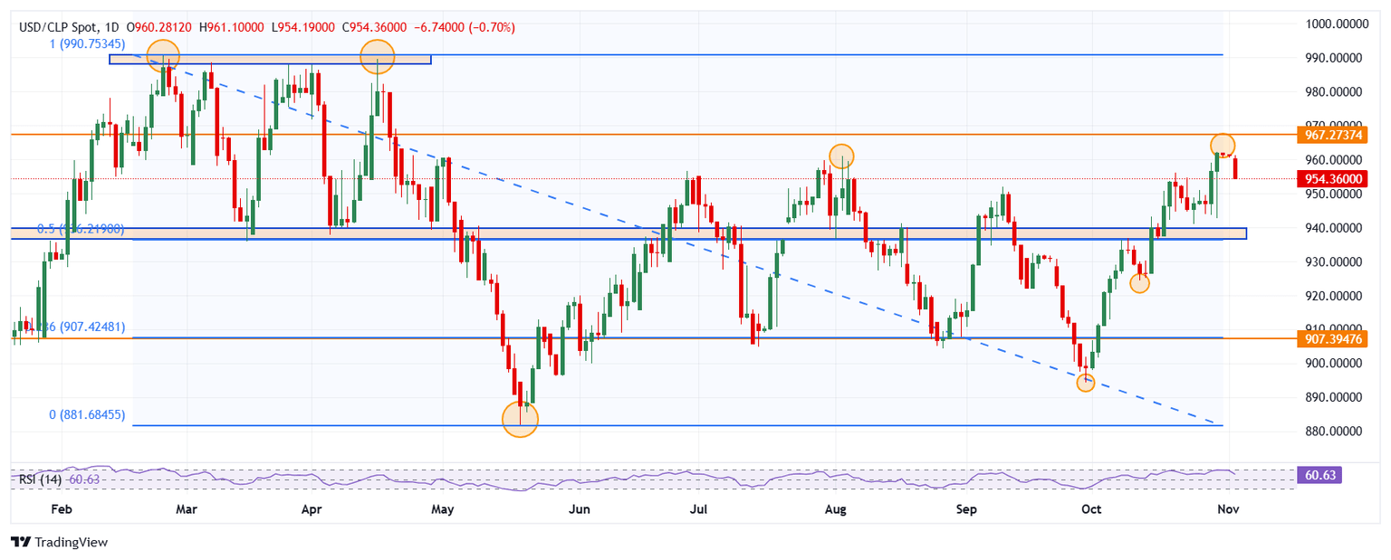 El USD/CLP marcó un máximo del día en 961.10, atrayendo vendedores agresivos que llevaron el cruce a un mínimo de tres días en 954.19. Actualmente, el Dólar estadounidense opera sobre 954.43 frente al Peso chileno, perdiendo un 0.71% diario.