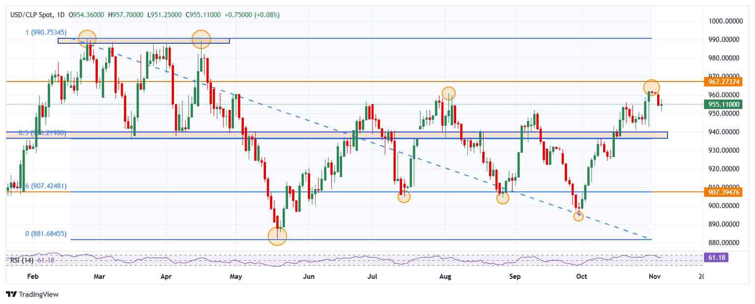 El Peso chileno formó una resistencia de corto plazo en 962.04, dada por el máximo del 31 de octubre. La siguiente zona de resistencia clave está en 989.40, punto pivote del 17 de abril.