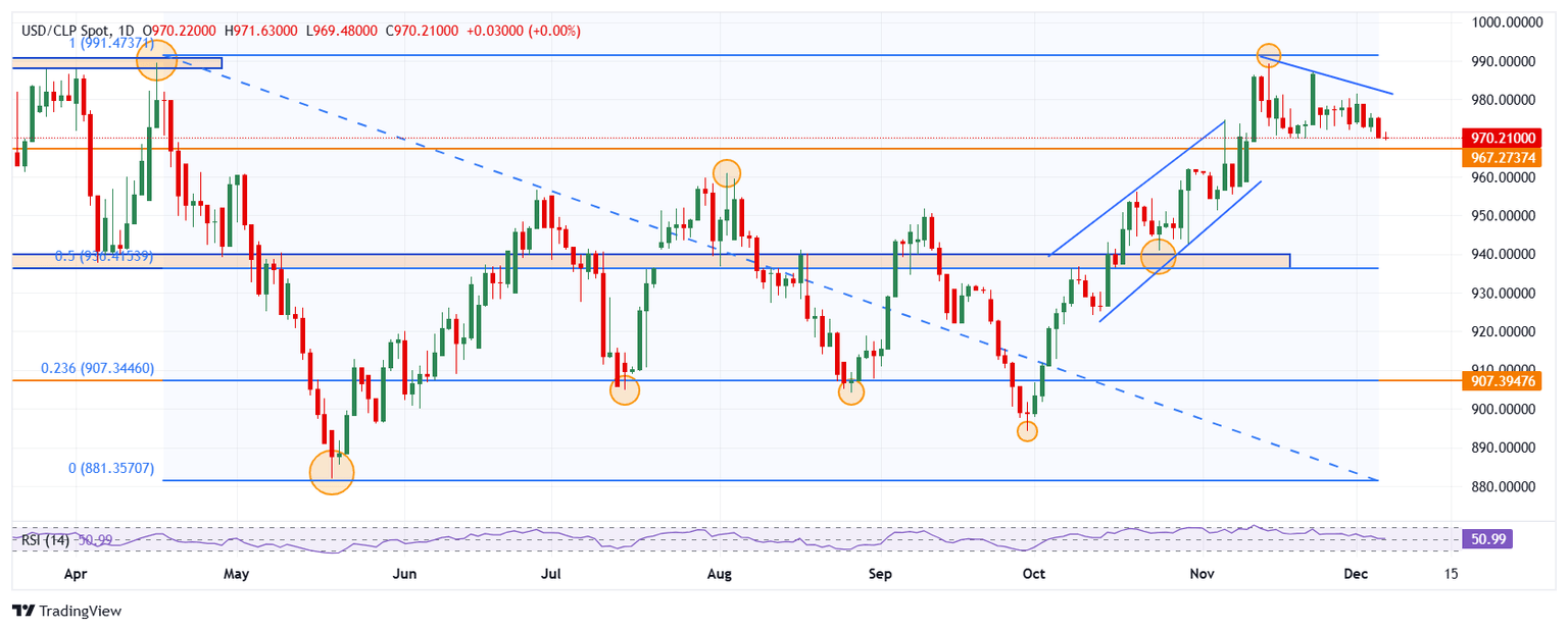 El USD/CLP marcó un máximo del día en 971.63, encontrando vendedores que llevaron el cruce a un mínimo no visto desde el 11 de noviembre en 967.35. Al momento de escribir, el USD/CLP cotiza en 968.87, permaneciendo prácticamente plano.