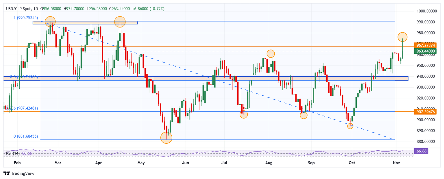 El USD/CLP registró un mínimo del día en 956.58, cuando atrajo compradores agresivos que impulsaron la paridad a un máximo de casi siete meses no visto desde el 18 de abril en 974.70. Actualmente, el Dólar estadounidense opera en 962.86 frente al Peso chileno, subiendo un 0.66% el día de hoy.