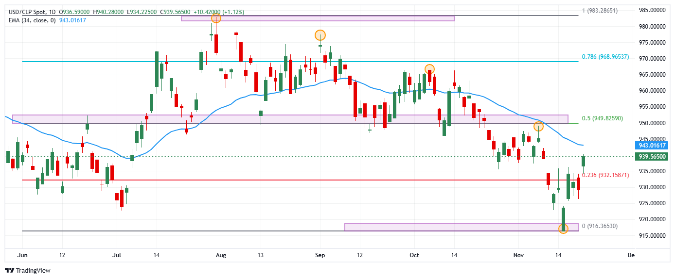 - El Dólar estadounidense gana tracción frente al Peso chileno, visitando máximos del 10 de noviembre en 938.97.