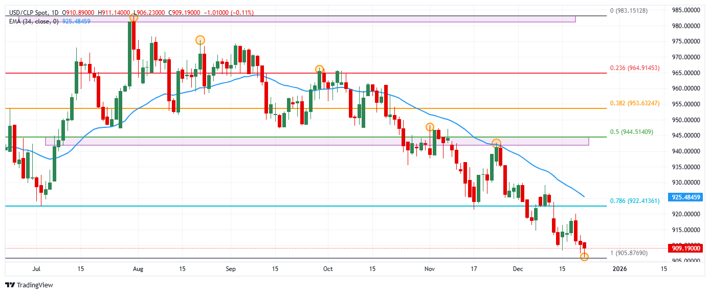El USD/CLP registró un máximo del día den 911.14, atrayendo vendedores que arrastraron la paridad a mínimos del 2 de octubre de 2024 en 906.23. Actualmente, el USD/CLP opera en 909.25, cayendo un 0.09% en el día.