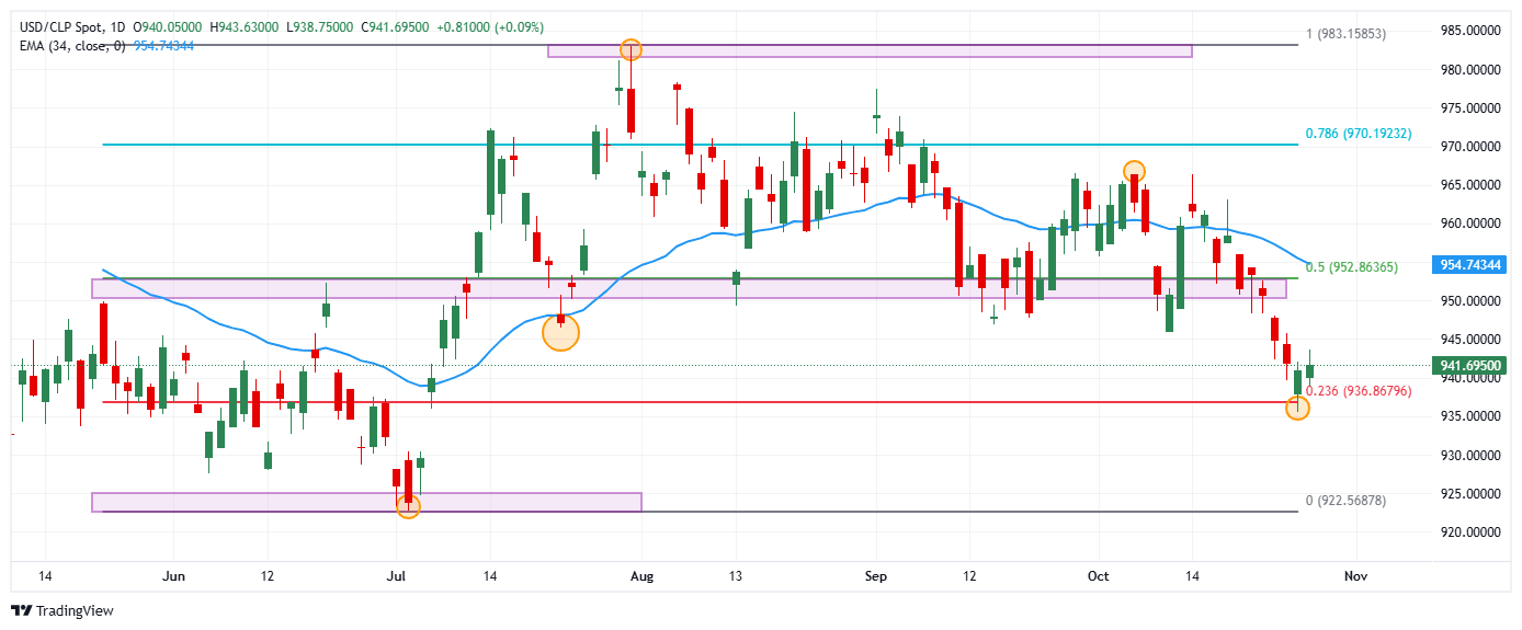 El USD/CLP registró un mínimo del día en 938.75, atrayendo compradores que impulsaron la paridad a máximos del 24 de octubre 943.63. Al momento de escribir, el USD/CLP opera en 941.67, subiendo un 0.08% en la segunda jornada de la semana.
