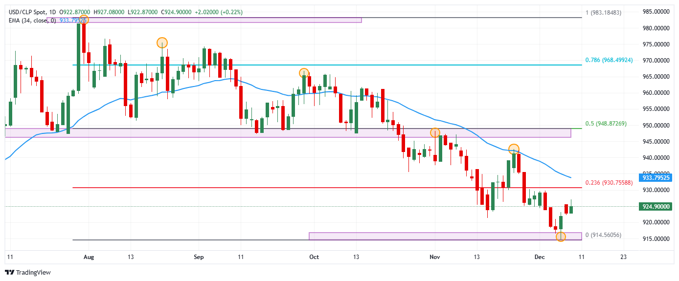 El USD/CLP estableció un mínimo diario en 922.87, encontrando compradores que llevaron la paridad a máximos del 2 de diciembre en 927.08. Actualmente, el USD/CLP sube un 0.23%, operando sobre 925.05.