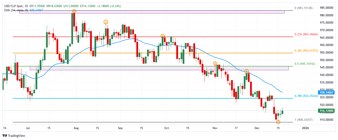 El USD/CLP registró un mínimo del día en 913.00, atrayendo compradores que impulsaron la paridad a máximos del 11 de diciembre en 918.03. Actualmente, el USD/CLP se negocia en 916.04, subiendo un 0.25% diario.