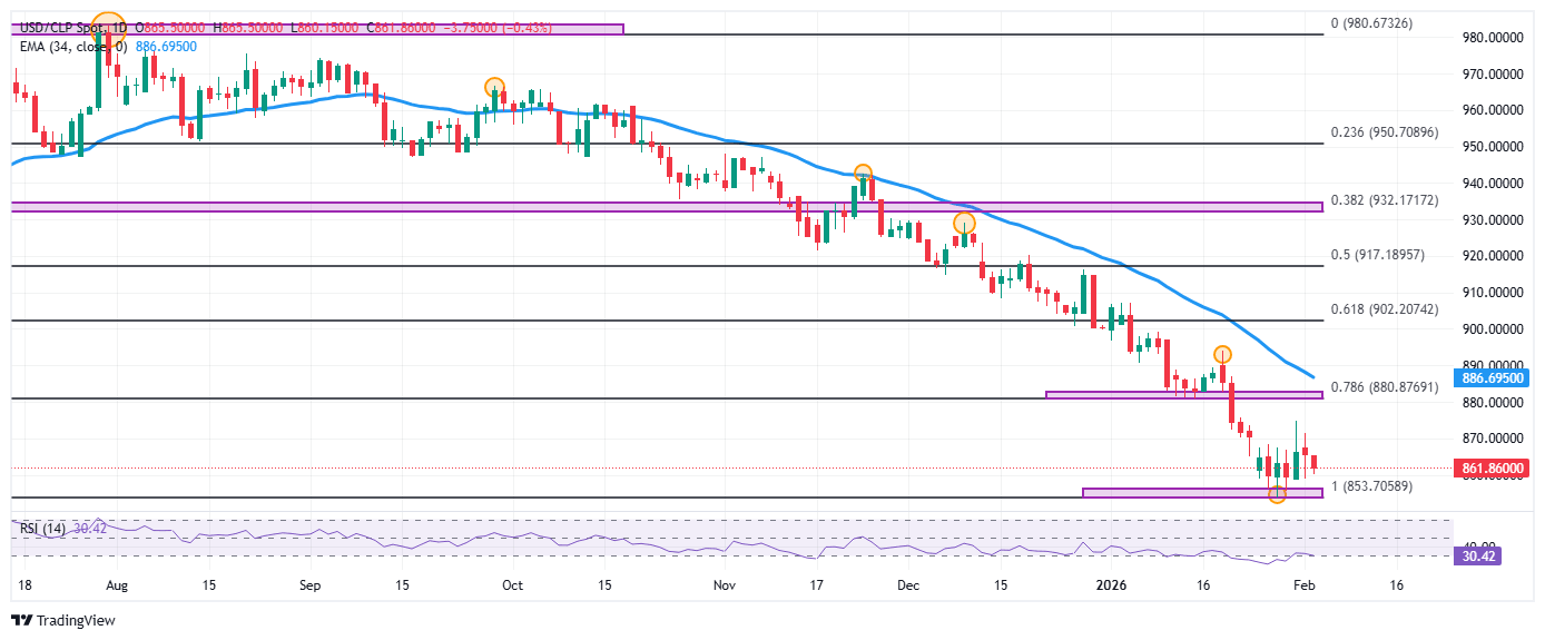 - El Dólar estadounidense se desliza frente al Peso chileno, cotizando al momento de escribir en 861.85.
