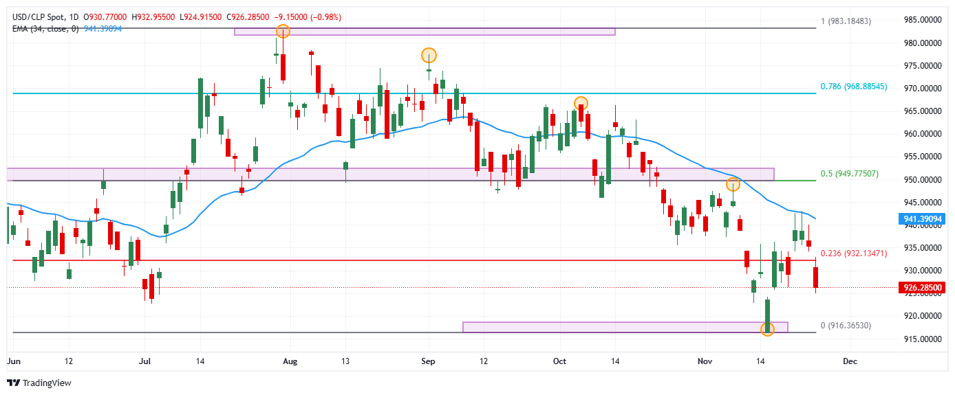 El USD/CLP marcó un máximo del día en 932.95, encontrando vendedores agresivos que arrastraron la paridad a mínimos del 18 de noviembre en 924.91. En estos momentos, el USD/CLP opera en 926.28, perdiendo un 0.98% en la tercera jornada de la semana.