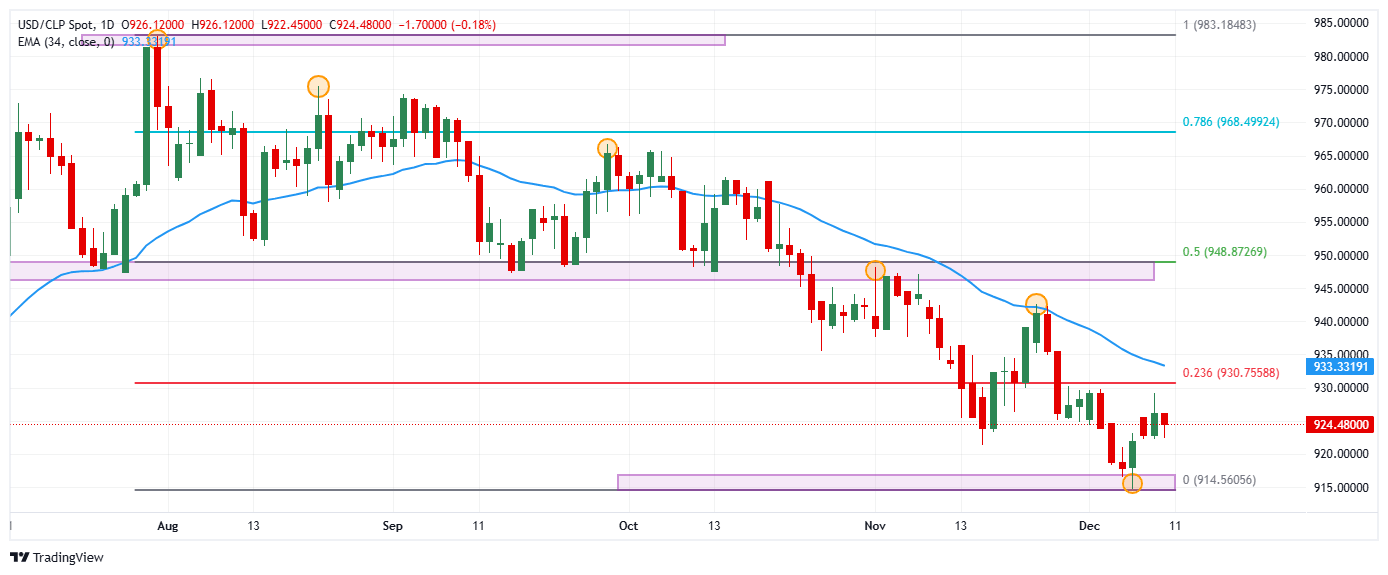 El USD/CLP formó una resistencia de corto plazo en 942.65, máximo del 24 de noviembre. La siguiente resistencia clave está en 948.15, máximo del 3 de noviembre en convergencia con el retroceso al 50% de Fibonacci. A la baja, el soporte más cercano se encuentra en 894.25, mínimo del 30 de septiembre de 2024. La zona de soporte importante la observamos en 881.85, punto pivote del 20 de mayo de 2024.
