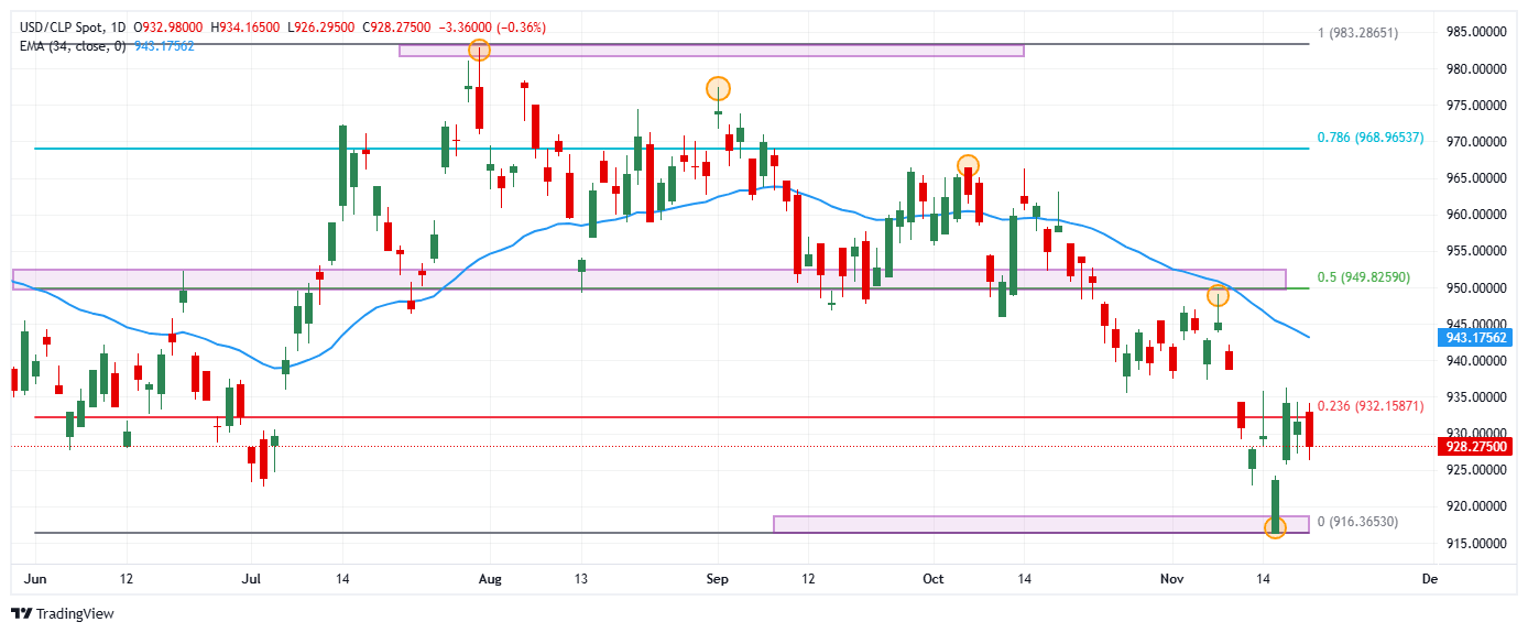 - El Dólar estadounidense se desliza frente al Peso chileno, llegando a mínimos del 18 de noviembre en 926.36.