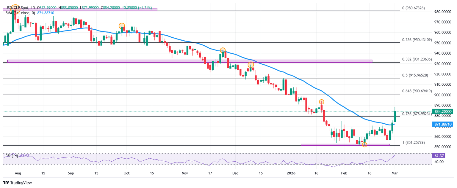 - El Dólar estadounidense repunta frente al Peso chileno, alcanzando máximos del 20 de enero en 888.05