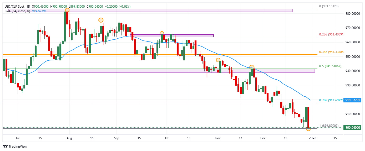 El USD/CLP estableció un soporte de corto plazo en 900.90, dado por el mínimo del 26 de diciembre. Al alza, la resistencia más cercana se encuentra en 942.65, máximo del 24 de noviembre en convergencia con el promedio móvil exponencial de 34 periodos. La siguiente zona de resistencia importante está en 966.67, punto pivote del 29 de septiembre.
