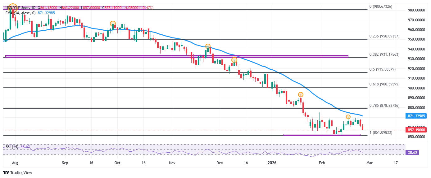 - El Dólar estadounidense se desliza frente al Peso chileno, llegando a mínimos del 13 de febrero en 857.00.