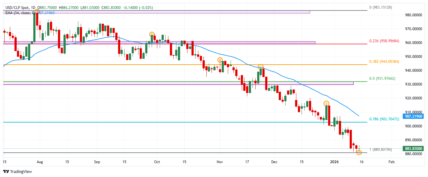 El USD/CLP estableció un máximo diario en 886.27, donde encontró vendedores que arrastraron la paridad a mínimos no vistos desde el 4 de enero de 2024 en 881.03. Al momento de escribir, el USD/CLP se negocia en 883.92, perdiendo un 0.02% en la jornada del jueves.
