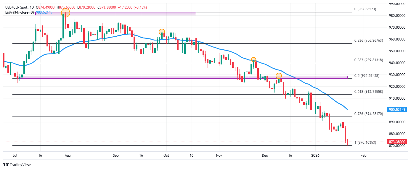 El USD/CLP reaccionó a la baja desde un máximo del día en 875.65, atrayendo vendedores agresivos que llevaron la paridad a mínimos no vistos desde el 21 de diciembre de 2023 en 870.28. Actualmente, el USD/CLP opera sobre 874.06, cayendo un 0.04% en la sesión del jueves.