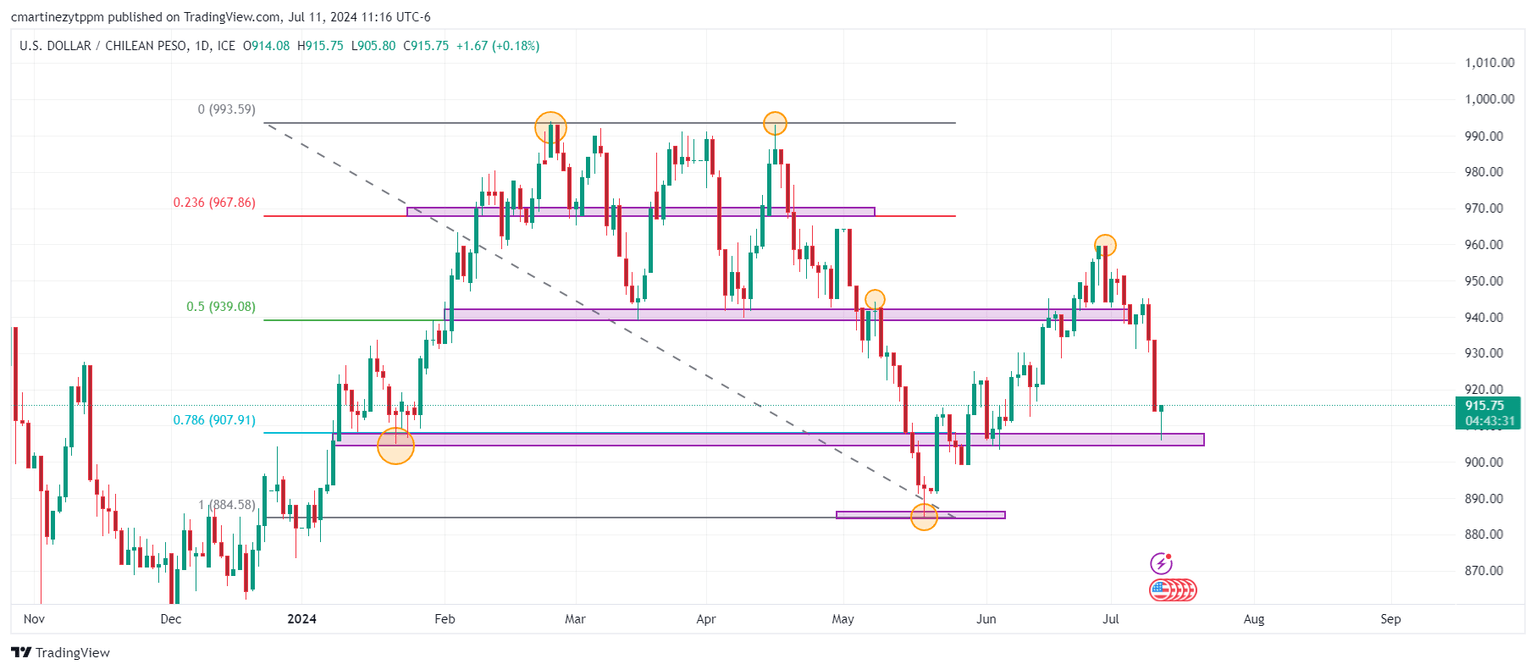 El USD/CLP ha reaccionado en un primer soporte ubicado en 905.80, mínimo del día de hoy que converge con el retroceso al 78.6% de Fibonacci. El siguiente soporte se encuentra en 885.00, mínimo del 20 de mayo. La resistencia más cercana se ubica en 960.00, máximo del 27 de junio.