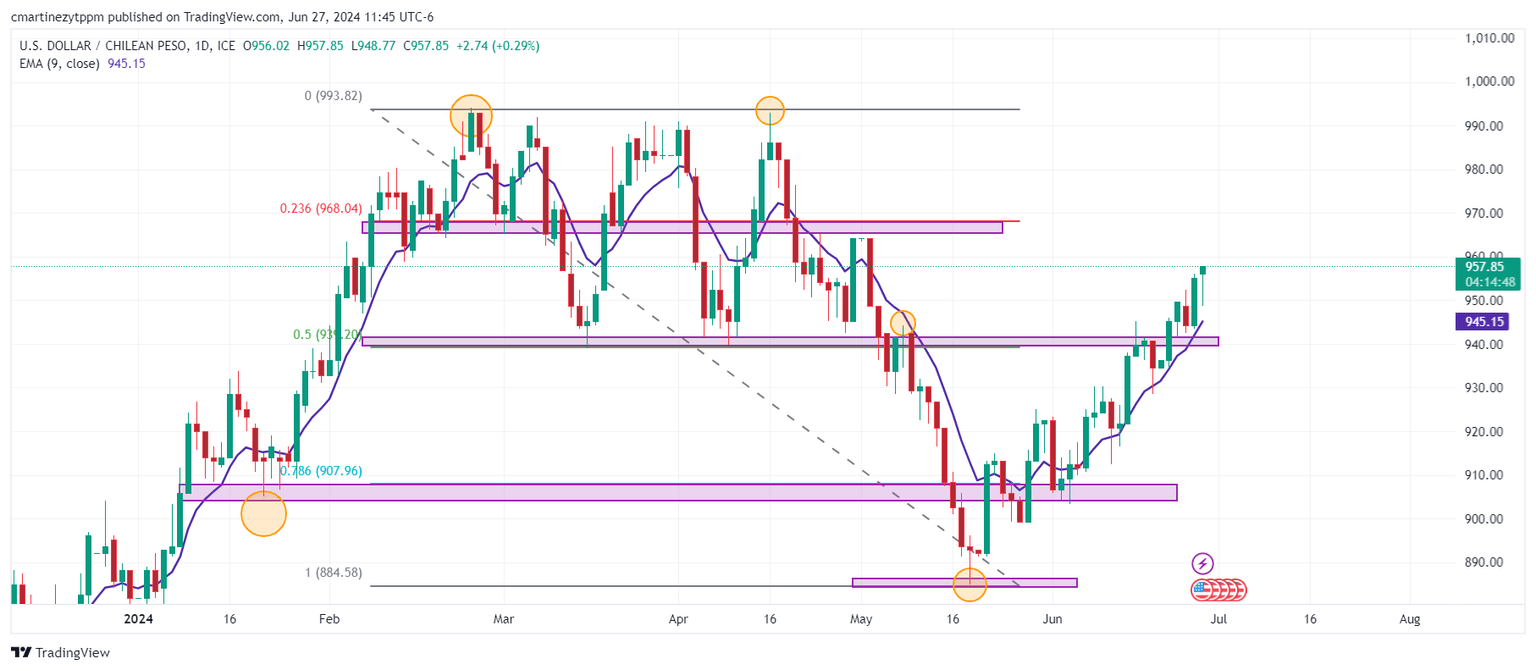 El USD/CLP marcó un mínimo del día durante la sesión europea en 948.77, donde encontró compradores que llevaron el par a un máximo diario en 957.85. Al momento de escribir, el precio del Dólar estadounidense frente al Peso chileno cotiza en 956.94 ganando un 0.20% en el día.