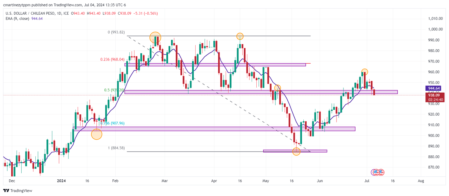 El USD/CLP formó un soporte en el corto plazo en 940.00, en confluencia con el retroceso al 50% de Fibonacci. El siguiente soporte se encuentra en 905.00, mínimo del 5 de junio. La resistencia más cercana se ubica en 959.00, máximo del 27 de junio.