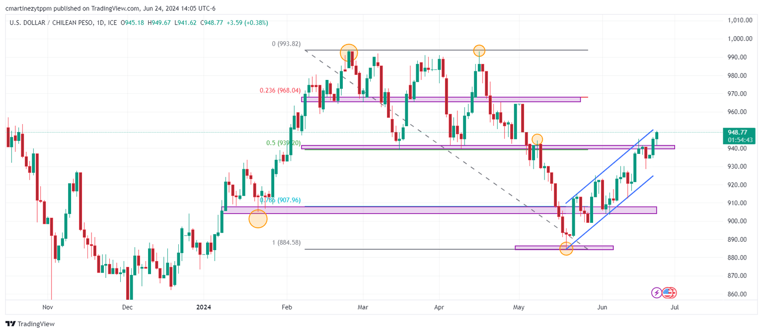 El USD/CLP se mantiene por encima del nivel clave de 940.00 apuntando a la siguiente resistencia en 965.00. El par se encuentra dentro en un canal ascendente y se dirige a niveles superiores.