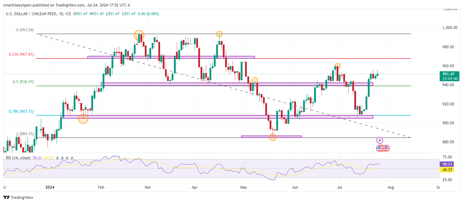 El USD/CLP formó un primer soporte en 942.51, mínimo del 19 de julio. El siguiente soporte se encuentra en 905.80, en convergencia con el retroceso al 78.6% de Fibonacci. La resistencia más cercana está ubicada en 959.69, máximo del 27 de junio.