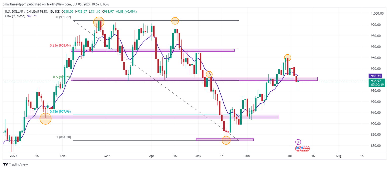 El USD/CLP estableció un soporte en el corto plazo cercano a 940.00, en convergencia con el retroceso al 50% de Fibonacci. El siguiente soporte se encuentra en 905.00, mínimo del 5 de junio. La resistencia más cercana se ubica en 959.00, máximo del 27 de junio.