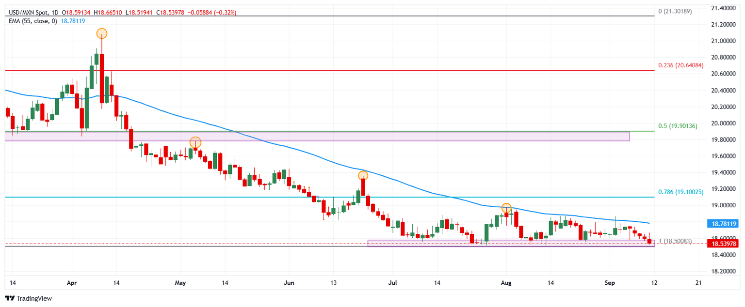 - El USD/MXN se desliza un 0.41% en la jornada del jueves, visitando mínimos del 13 de agosto en 18.51.
