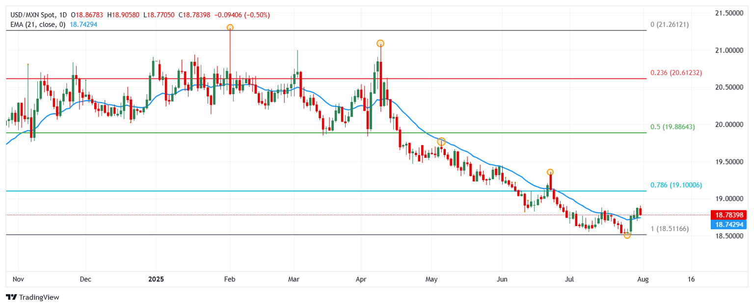 El USD/MXN reaccionó la baja desde máximos del 27 de junio en 18.90, donde atrajo vendedores agresivos que llevaron la paridad a un mínimo del día en 18.77. En estos momentos, el USD/MXN cotiza en 18.80, cayendo un 0.38% el día de hoy.