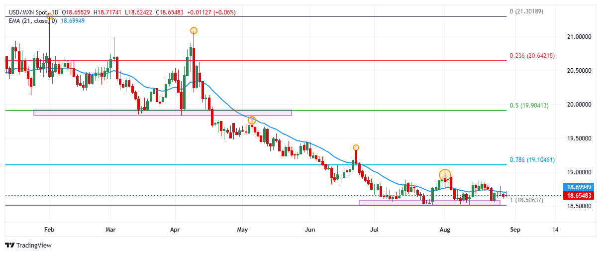 El USD/MXN reaccionó a la baja desde una resistencia de corto plazo dada por el máximo del 1 de agosto en 18.98. La siguiente resistencia clave la encontramos en 19.35, punto pivote del 23 de junio. Al sur, el soporte más cercano está en 18.51, mínimo del 28 de julio.