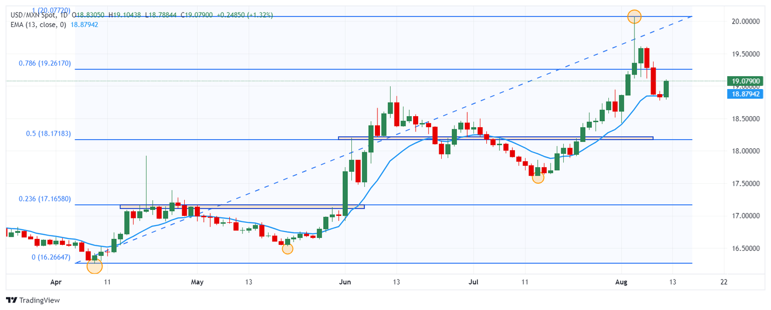 El USD/MXN formó un primer soporte en el corto plazo en 18.77, dado por el mínimo del 9 de agosto y que converge con el Promedio Móvil Exponencial de 13 periodos. El siguiente soporte lo observamos en 17.60, punto pivote del 12 de julio. La resistencia más cercana se encuentra en 20.06, máximo alcanzado el 5 de agosto.