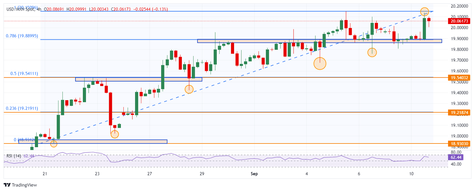 El USD/MXN marcó un mínimo del día en 19.86 $, encontrando compradores agresivos que llevaron la paridad a un máximo de tres días en 20.13 $. Actualmente, el precio del dólar estadounidense opera frente al Peso mexicano en 20.06, subiendo un 1.00% el día de hoy.