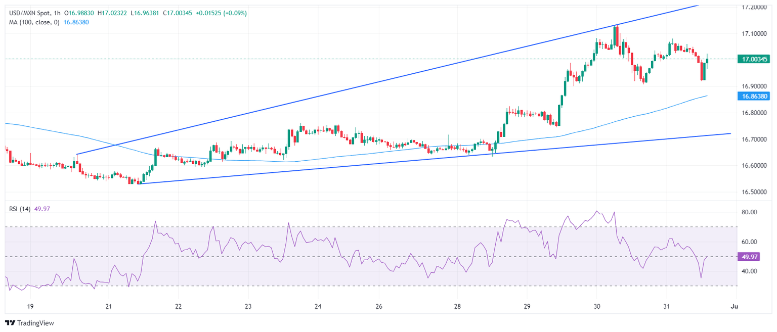 El USD/MXN comenzó la jornada del viernes probando un máximo intradía en 17.08, pero tras la publicación del dato del PCE subyacente de EE.UU., que fue inferior a lo esperado en su lectura mensual, el par cayó a mínimos del día en 16.91. Al momento de escribir, el Dólar estadounidense cotiza frente al Peso mexicano sobre 16.97, perdiendo un 0.26% diario.