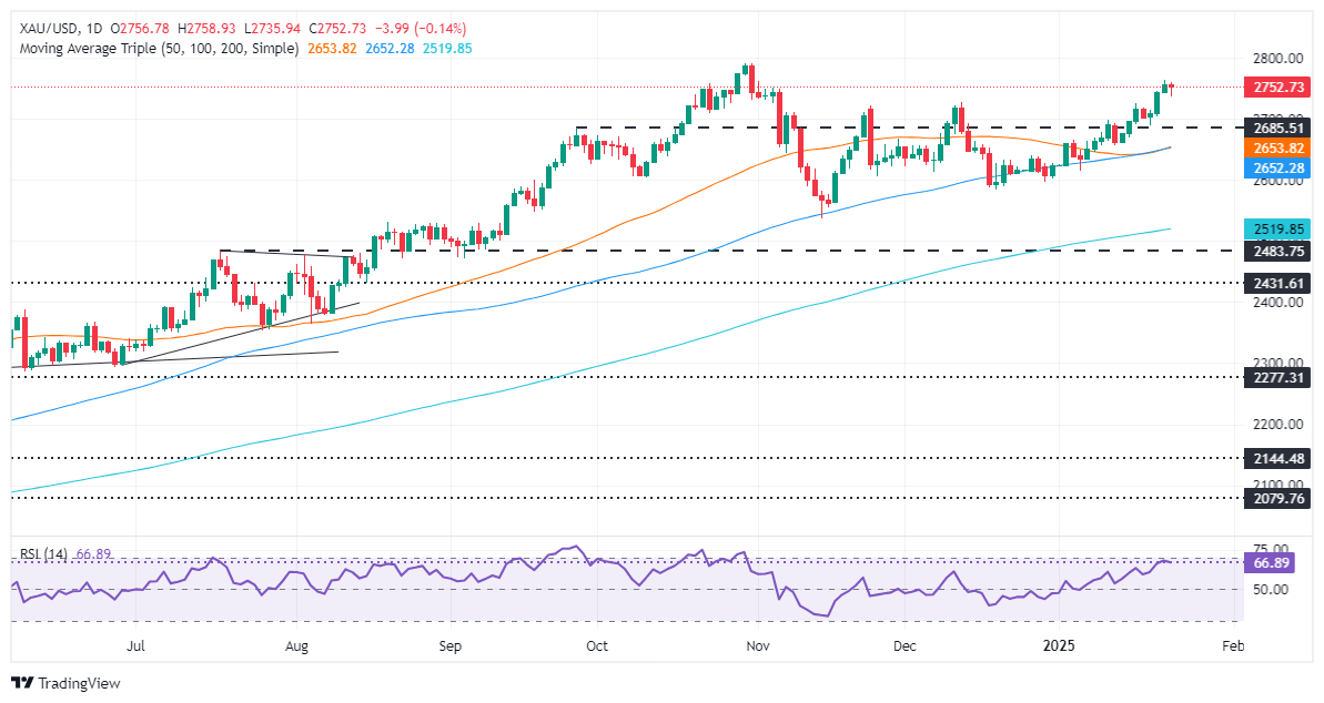 Los precios del Oro se consolidan cerca de 2.750$ mientras los operadores toman ganancias antes de la decisión de la Fed la próxima semana sobre la política monetaria. Si la Fed mantiene las tasas sin cambios, sería la primera vez que el banco hace una pausa, lo que sería perjudicial para los compradores de lingotes.