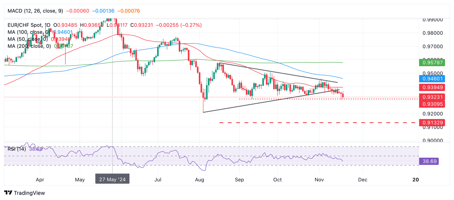 EUR/CHF consolida su ruptura bajista desde un patrón de Triángulo y cae.