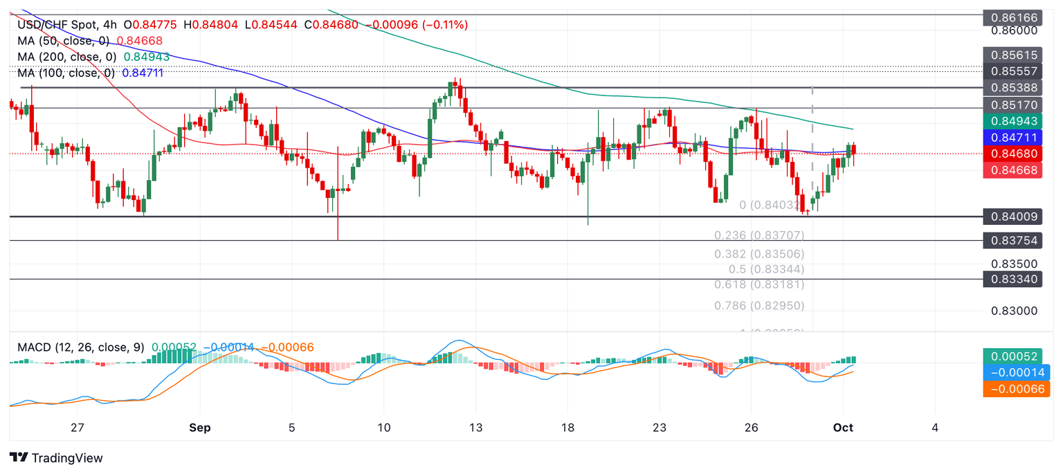 USD/CHF probablemente continuará subiendo. Una ruptura por encima del máximo de 0.8480 llevaría a una extensión hasta un objetivo en torno a 0.8517 (máximos del 23 y 26 de septiembre) seguido por el techo del rango en 0.8539.