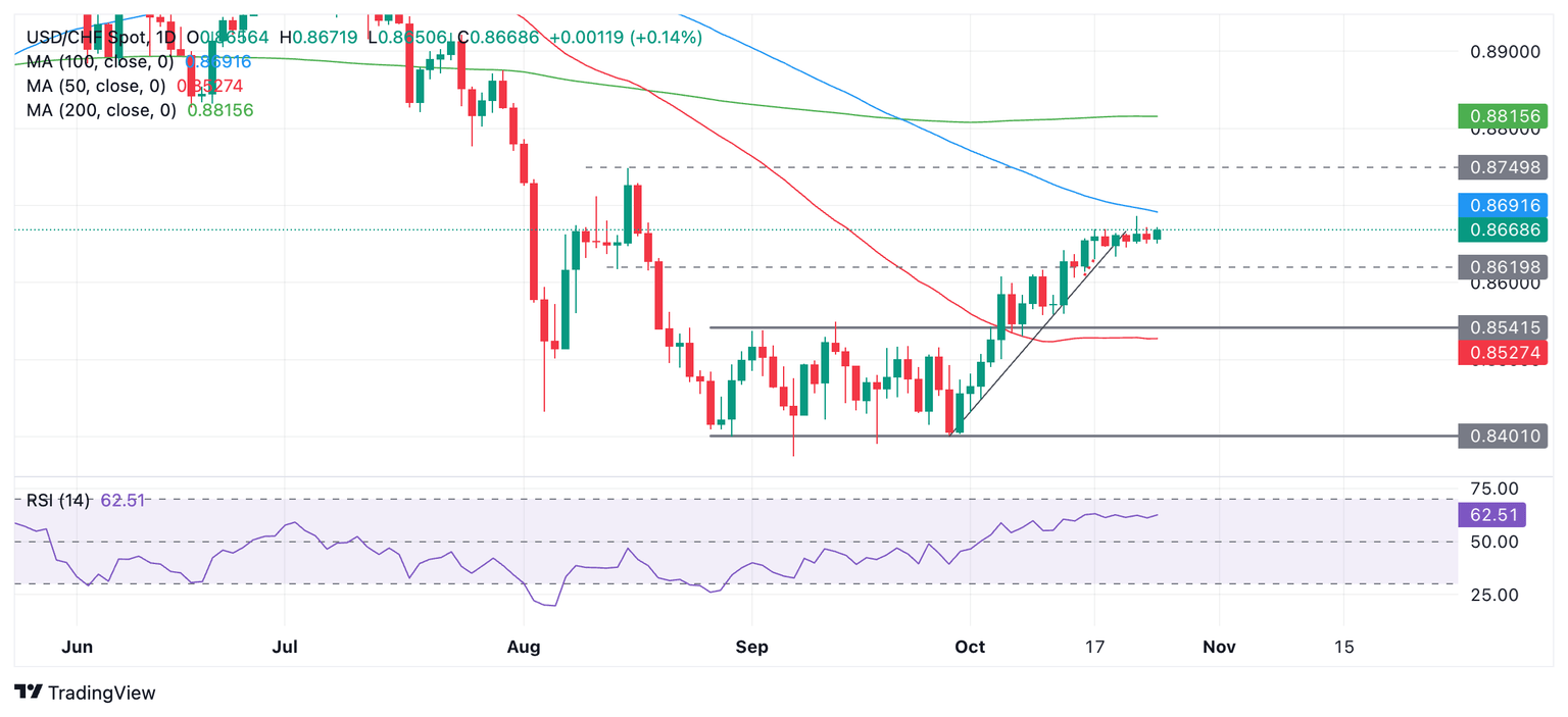 El USD/CHF se mantiene plano en los 0.8660 después de pausar su subida desde los mínimos de finales de septiembre. El par está cerca de la media móvil simple (SMA) de 100 días (azul), actualmente situada en 0.8691.