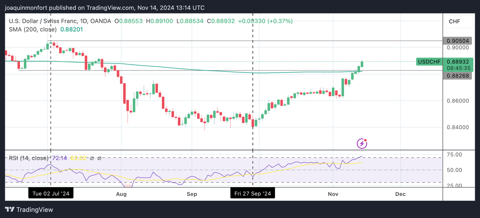 El USD/CHF rompe por encima de la media móvil simple (SMA) de 200 días y extiende su tendencia alcista a corto y mediano plazo.