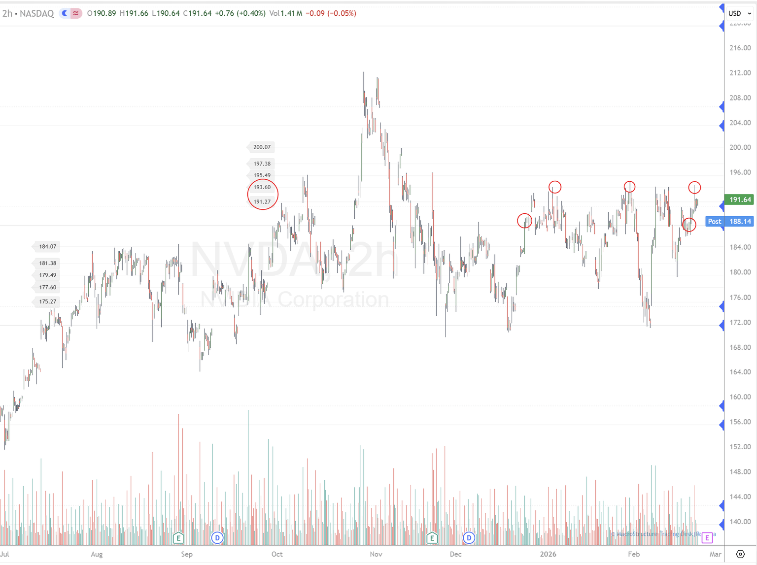 NVIDIA (NVDA) se dirige a la publicación de ganancias del miércoles 25 de febrero en una zona de decisión técnica clave, con el precio una vez más probando la banda de resistencia 191–193 que ha limitado múltiples intentos de recuperación desde finales de diciembre de 2025.