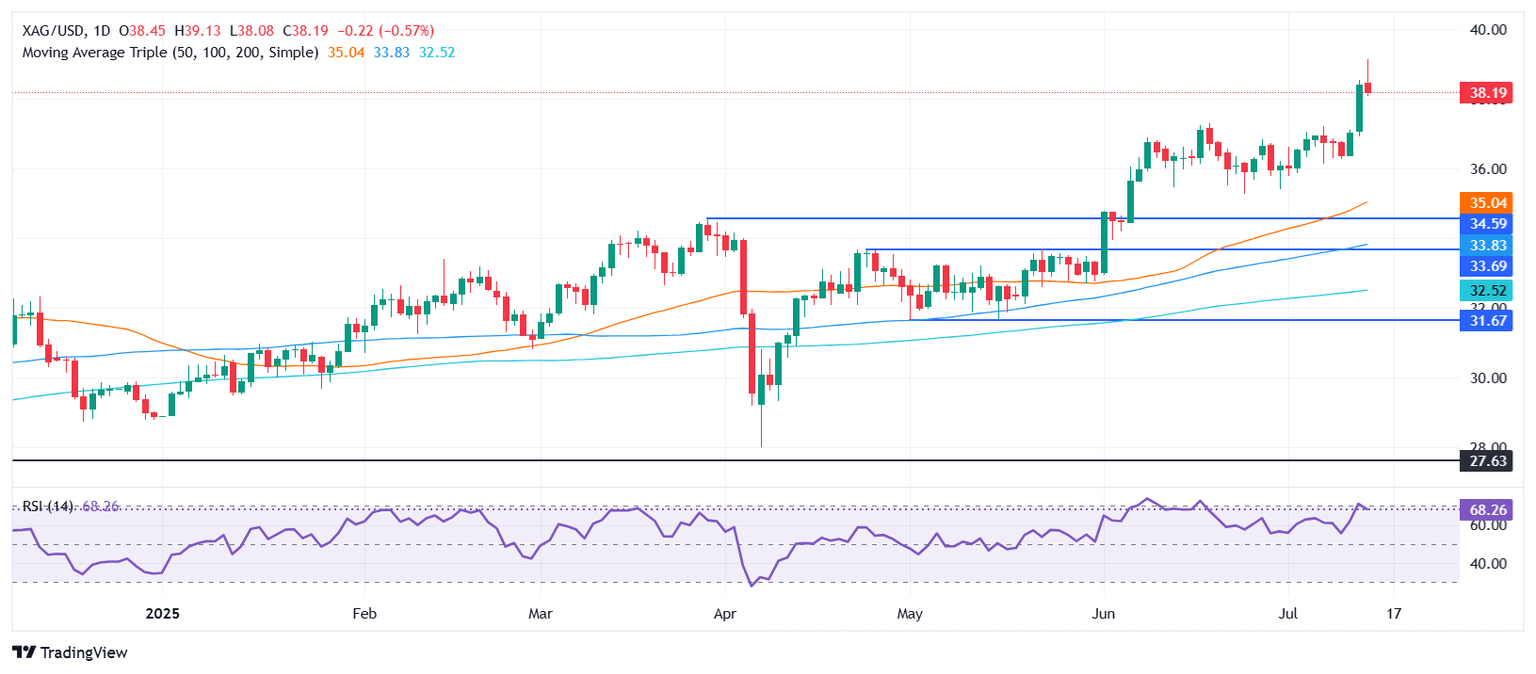 El metal gris tiene un sesgo alcista, a pesar de caer por debajo de la cifra de 39.00$ tras alcanzar máximos de varios años en 39.12$. El Índice de Fuerza Relativa (RSI) indica que los compradores aún están en control, aunque el XAG/USD bajó hacia 38.00$.