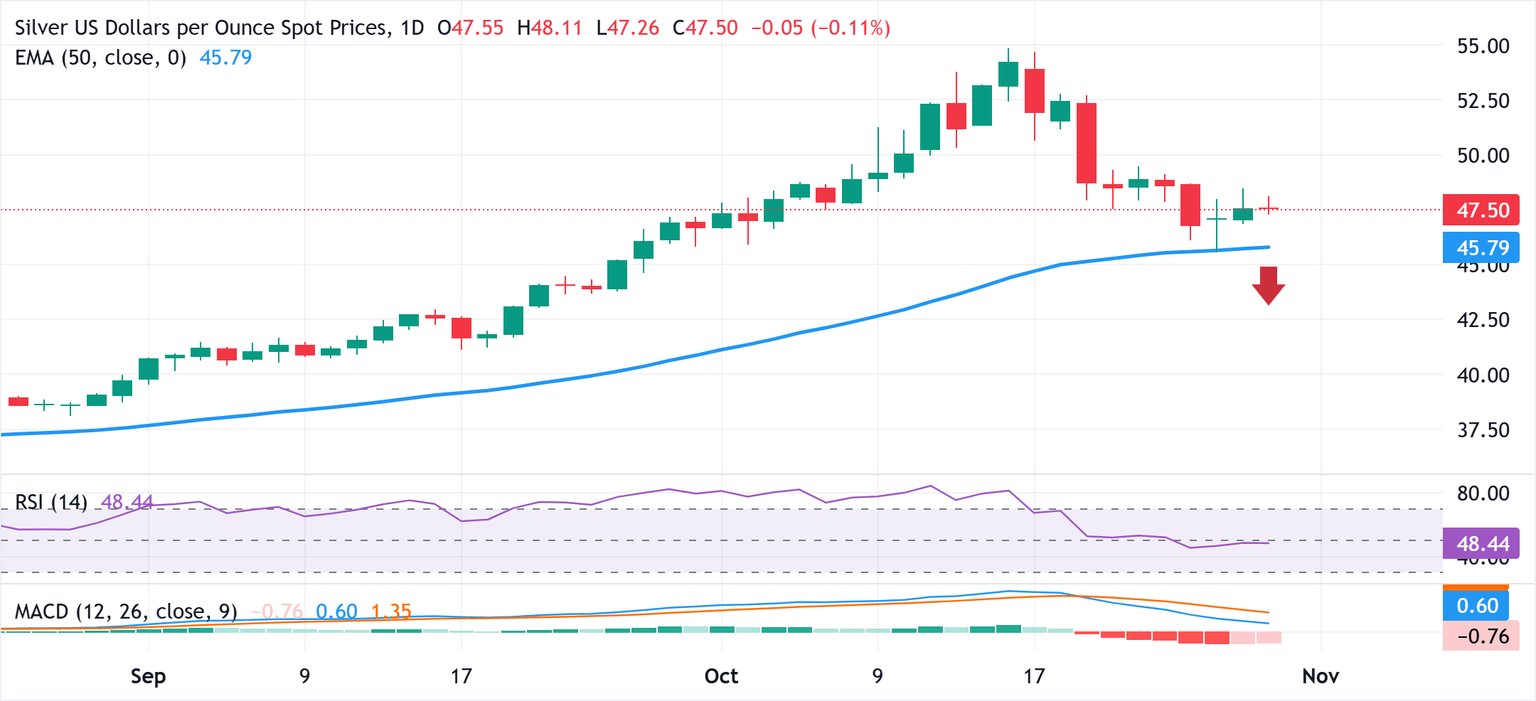 La Plata (XAG/USD) lucha por encontrar aceptación por encima de la cifra redonda de 48.00$ y atrae a algunos vendedores durante la sesión asiática del jueves. El metal blanco, sin embargo, logra mantenerse cómodamente por encima de su nivel más bajo desde el 25 de septiembre, alcanzado el martes, y actualmente cotiza justo por debajo de los 47.00$, bajando un 0.20% en el día.