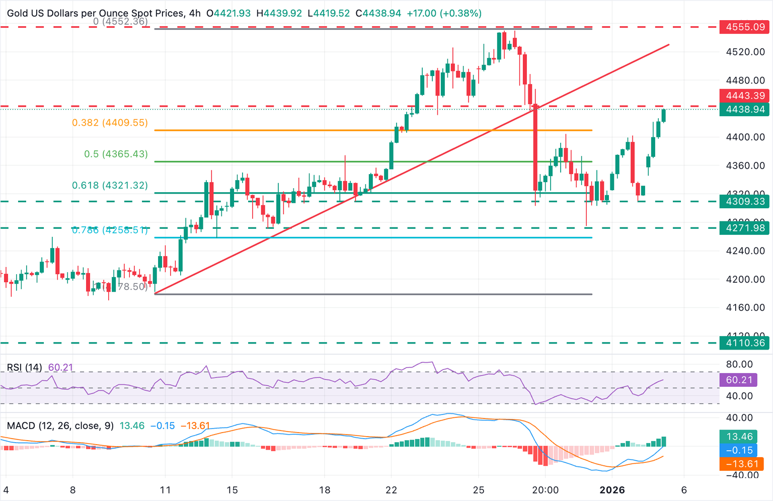 El XAU/USD ha rebotado desde el área entre los niveles de retroceso de Fibonacci del 61.8% y 76.2% y ha confirmado su recuperación, rompiendo por encima del área de 4.400$ (máximos del 30 de diciembre y 2 de enero). El Convergencia/Divergencia de Medias Móviles (MACD) se fortalece en territorio positivo, sugiriendo que los compradores han tomado el control. El Índice de Fuerza Relativa (RSI) se sitúa por encima de la línea media de 50.