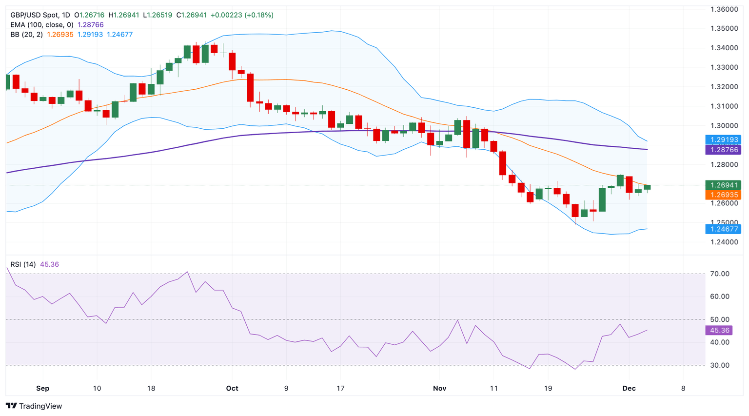 La perspectiva bajista del GBP/USD sigue vigente ya que el par principal se mantiene por debajo de la media móvil exponencial (EMA) clave de 100 días en el marco de tiempo diario. Además, el índice de fuerza relativa (RSI) de 14 días permanece limitado por debajo de la línea media alrededor de 45.35, lo que sugiere que no se puede descartar una mayor caída.