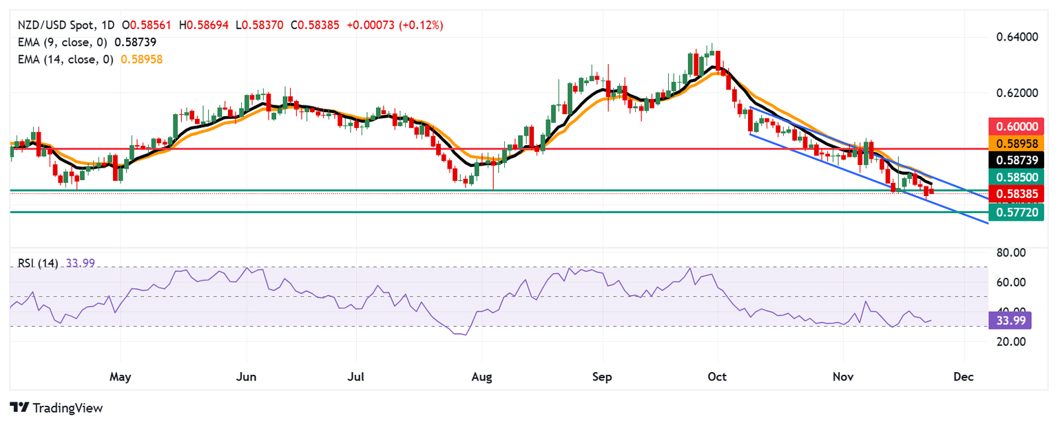 El par NZD/USD continúa su racha de pérdidas por cuarto día consecutivo, cotizando cerca de 0.5840 durante la sesión europea del lunes. Un análisis del gráfico diario indica una tendencia bajista fortalecida, ya que el par permanece confinado dentro de un patrón de canal descendente.