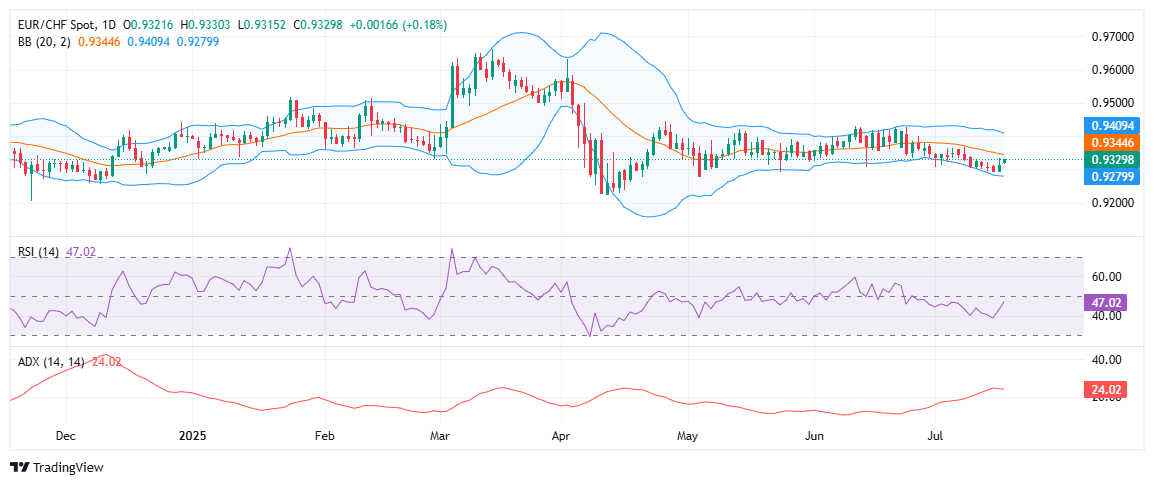 Desde un punto de vista técnico, el cruce EUR/CHF sigue atascado por debajo de la media móvil simple (SMA) de 20 días, que también sirve como la banda media de Bollinger y actualmente está posicionada en 0.9344. Este nivel continúa limitando los intentos al alza, actuando como una resistencia dinámica dentro de la consolidación más amplia.