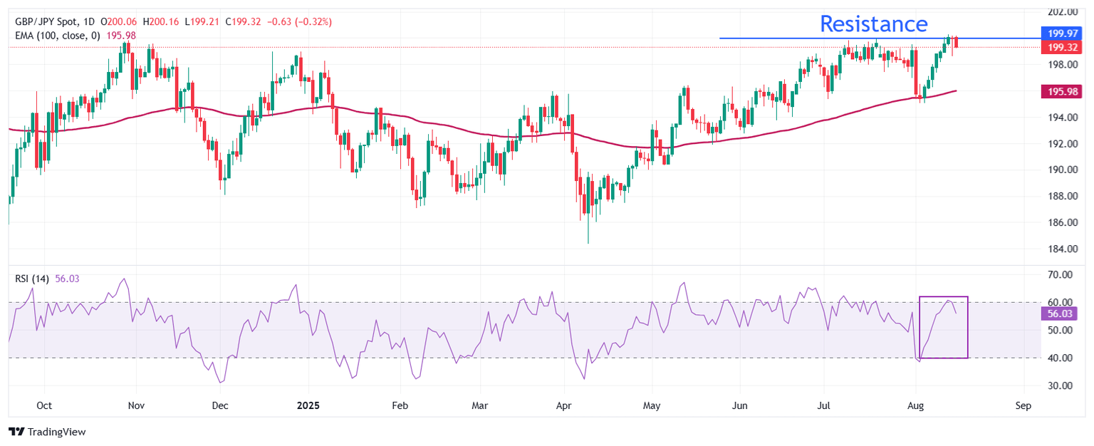 El GBP/JPY continúa enfrentando presión de venta cerca del nivel psicológico de 200.00. Sin embargo, la tendencia a corto plazo del cruce sigue siendo alcista, ya que la Media Móvil Exponencial (EMA) de 100 días se inclina al alza alrededor de 195.95.