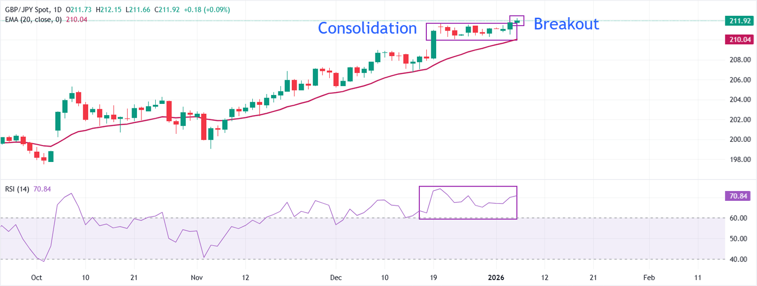 En el gráfico diario, el GBP/JPY se negocia a 211.92 al momento de escribir. La media móvil exponencial (EMA) de 20 días sube y proporciona soporte en 210.04. El precio se mantiene por encima de este indicador ascendente, preservando el sesgo alcista.