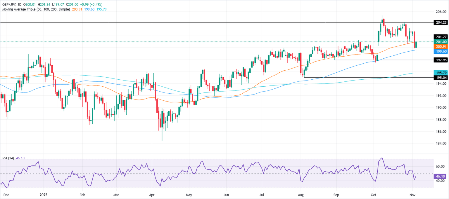 Si el GBP/JPY cae por debajo de 201.00, el siguiente soporte sería 199.61, antes del mínimo del 2 de octubre de 197.49. Una vez superado, la próxima parada sería la SMA de 200 días en 195.85.