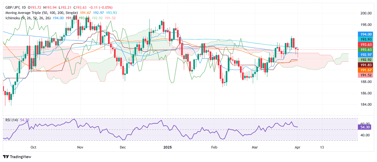 El GBP/JPY comienza la sesión asiática del miércoles con una nota positiva, después de registrar pérdidas del 0.22% el martes, ya que los inversores se volvieron reacios al riesgo debido a las políticas comerciales de EE.UU. Al momento de escribir, el par cotiza en 193.64, por debajo de la media móvil simple (SMA) de 200 días, que registra ganancias del 0.21%.