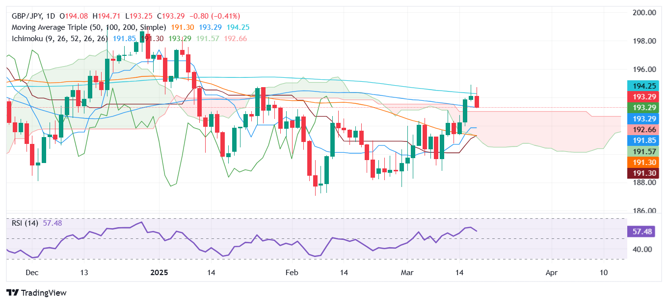 - El GBP/JPY cae a 193.28, finalizando una recuperación de tres días tras no lograr superar 195.00 y la SMA de 200 días en 194.18.
