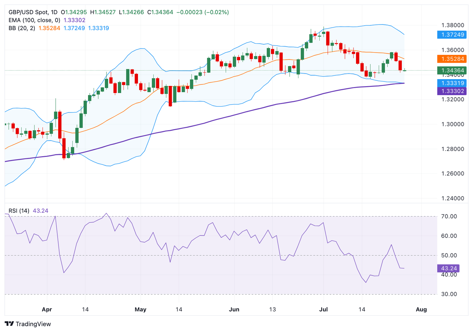 El par GBP/USD registra ganancias modestas cerca de 1.3440 durante las horas de negociación asiáticas del lunes. El último optimismo impulsado por un acuerdo comercial entre Estados Unidos (EE.UU.) y la Unión Europea (UE) desencadena una nueva ola de apetito de riesgo global, lo que impulsa a la Libra esterlina (GBP). Todas las miradas estarán puestas en la decisión de tasas de interés de la Reserva Federal (Fed) de EE.UU. más tarde el miércoles, sin cambios en la tasa esperados.