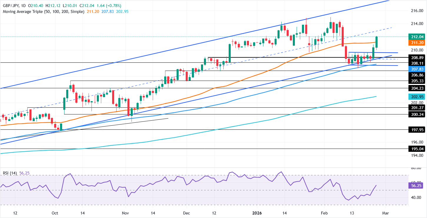 El GBP/JPY se recupera por segundo día consecutivo, subiendo más de un 0.80% a medida que se extiende la debilidad del Yen, ya que la Primera Ministra japonesa Takaichi nomina a dos académicos ligeramente "moderados" para la junta del Banco de Japón. El cruce se cotiza a 211.94, ligeramente por debajo del máximo del día de 212.12.