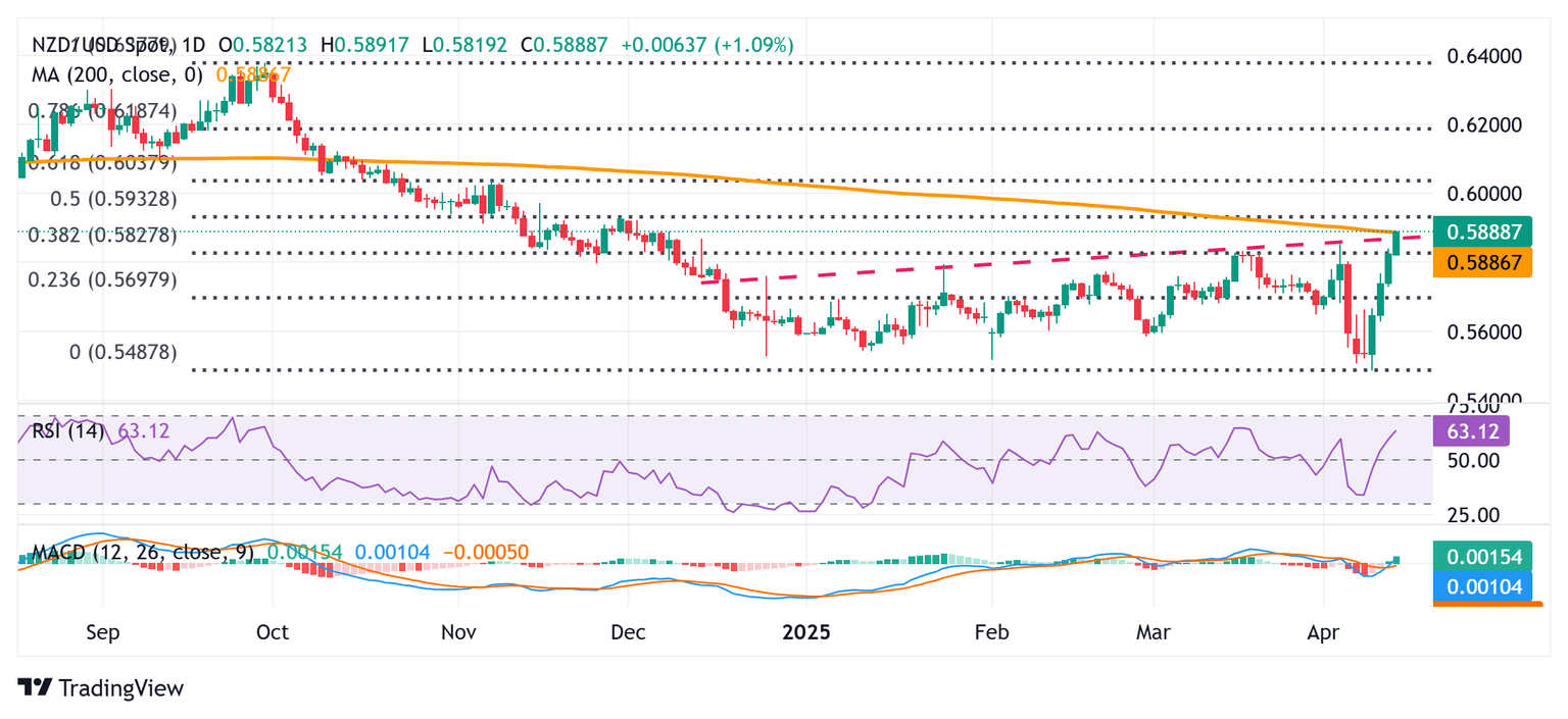 El mencionado nivel representa un obstáculo de confluencia que comprende una media móvil simple (SMA) de 200 días técnicamente significativa y una línea de tendencia ascendente de varios meses. Mientras tanto, una ruptura intradía por encima de la región de 0.5825-0.5830, o el nivel de retroceso de Fibonacci del 38.2% de la caída de septiembre de 2024 a abril de 2025, podría verse como un nuevo desencadenante para los alcistas. Esto, junto con osciladores positivos en el gráfico diario, sugiere que el camino de menor resistencia para el par NZD/USD es al alza.